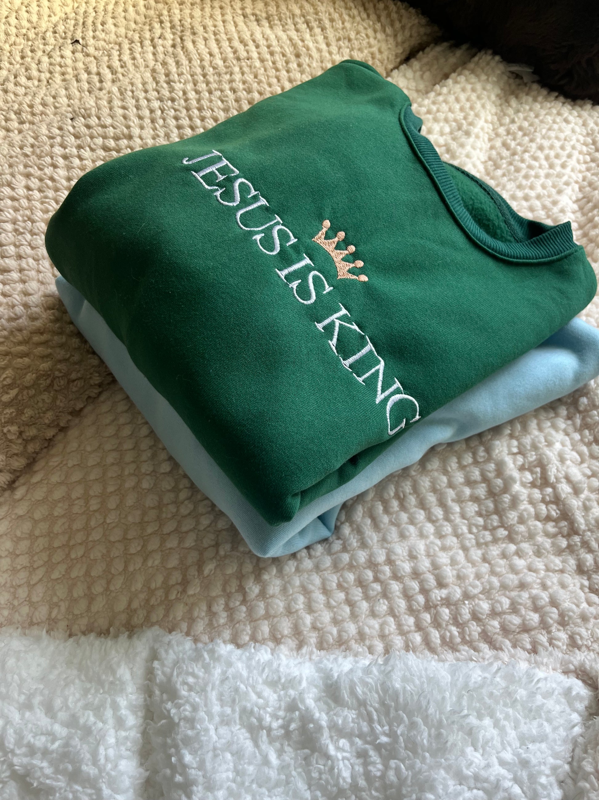 White "Jesus is King" text on shirt